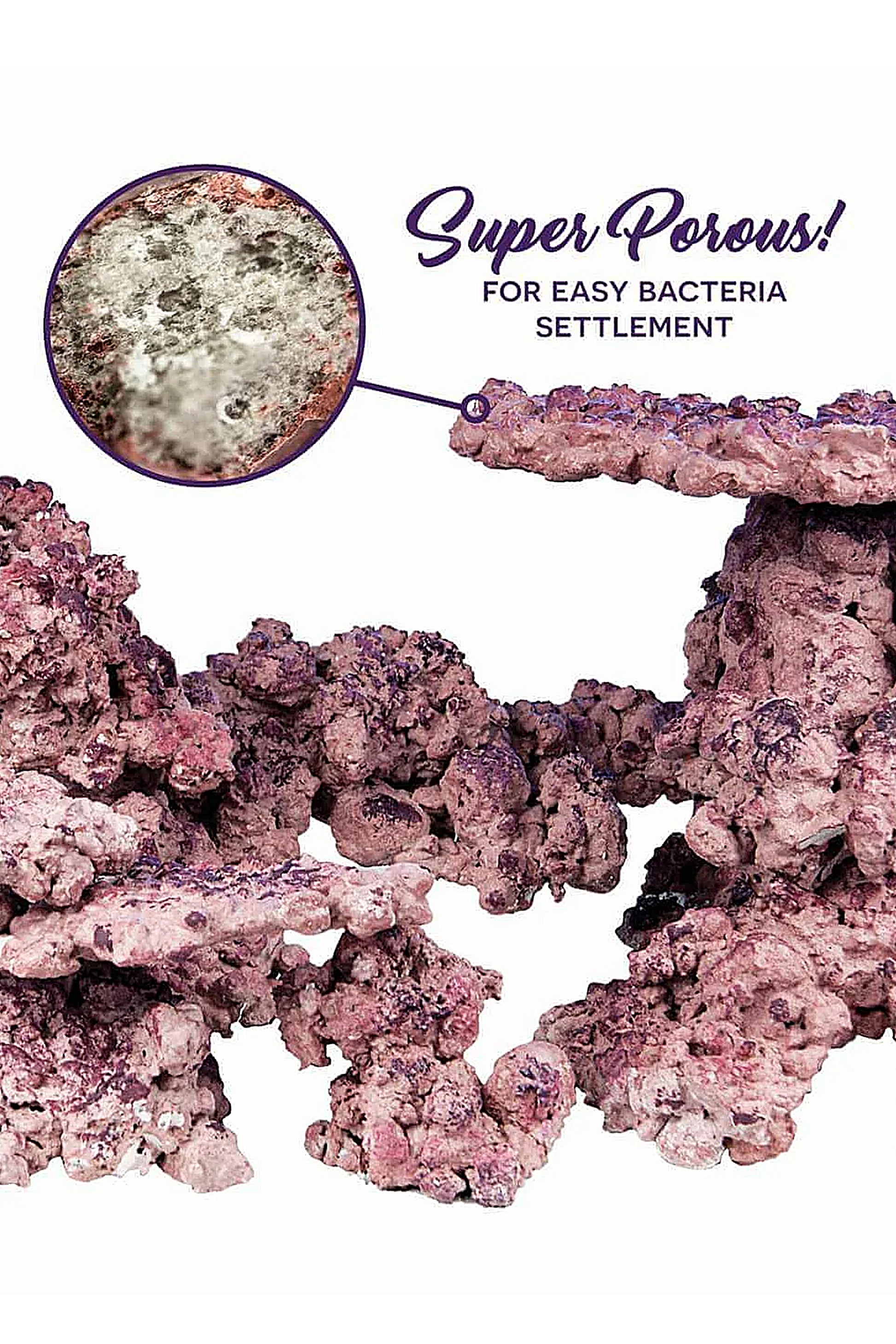 Esta roca no contiene contaminantes, algas no deseadas ni parásitos, y no alberga organismos invasivos como valonia, aiptasia, dinoflagelados o cangrejos no deseados. Su composición proporciona condiciones óptimas para el desarrollo de la vida marina y es completamente segura para los habitantes del acuario. Además, es un medio ideal para el asentamiento de bacterias, lo que garantiza un equilibrio biológico a largo plazo en el tanque.